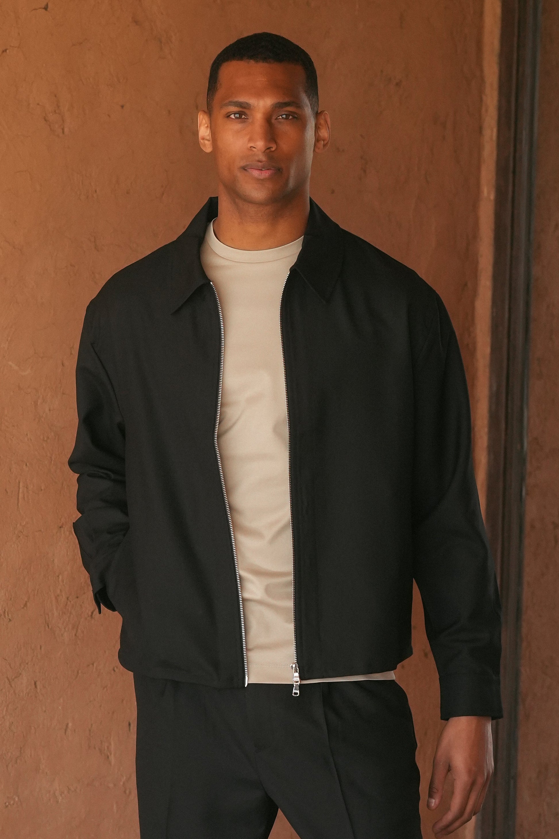 A premium wool blend jacket with a wide collar, zip closure, and side entry pockets. Layer it over any outfit for a sharp, tailored finish.